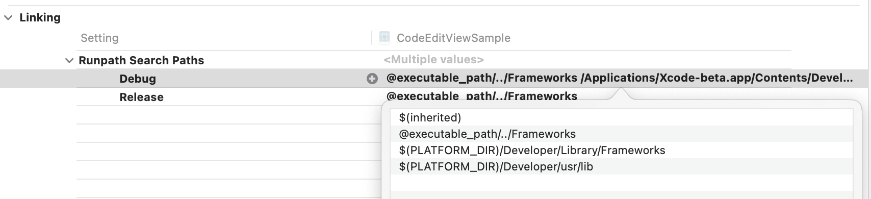 The project builds, but it won't run, because my application can't find XCTest at runtime, for that I modify LD_RUNPATH_SEARCH_PATHS (more about @rpath in my earlier post https://blog.krzyzanowskim.com/2018/12/05/rpath-what/)